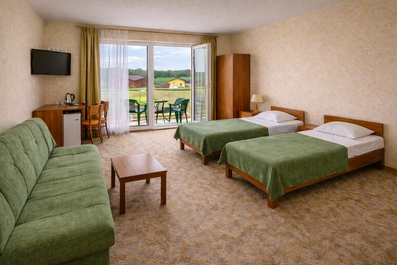 Pokój wyposażony jest w rozkładaną sofę 2-osobową oraz dwa łóżka pojedyncze ustawione naprzeciw siebie. Wnętrze utrzymane w klasycznym stylu – pokój został częściowo odświeżony, jednak nie był całkowicie remontowany. Do dyspozycji gości prywatna łazienka z prysznicem , WC i umywalką, balkon z widokiem na teren obiektu (na balkonie 4 krzesła i stolik), telewizor płaski zamontowany na ścianie, lodówka, czajnik elektryczny oraz podstawowe naczynia (szklanki, kubki, talerze, sztućce). W pokoju znajduje się również stolik kawowy, biurko, 2 krzesła, szafa oraz komoda.